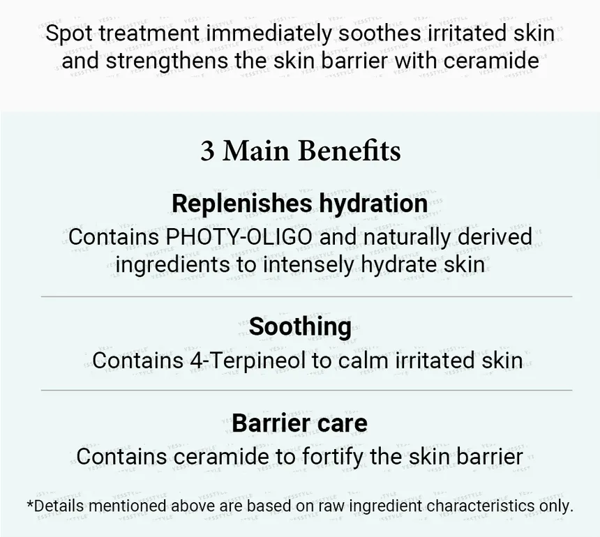 - Enriched with 4-Terpineol, PHOTY-OLIGO and plant-based ingredients (such as tea tree extracct) to effectively soothe irritated skin and deliver intense hydration.