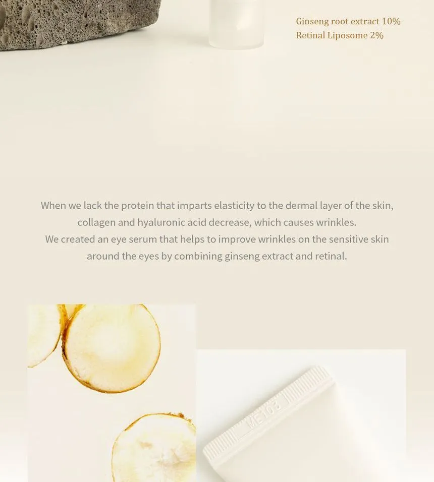 - Infused with 10% Ginseng Root Extract and 2% Retinal Liposome to improves wrinkles over sensitive eye area.