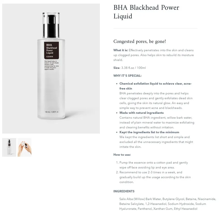 - Formulated with Betaine Salicylate (BHA) to remove excess sebum, dead skin cells and blackheads for healthier, clearer skin